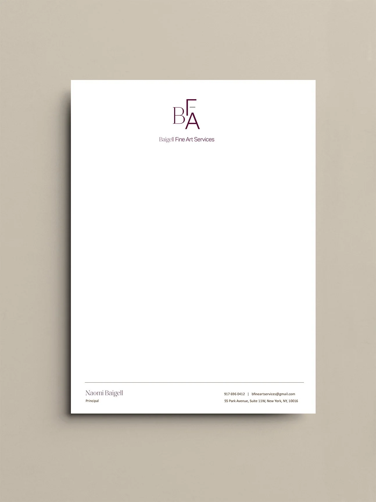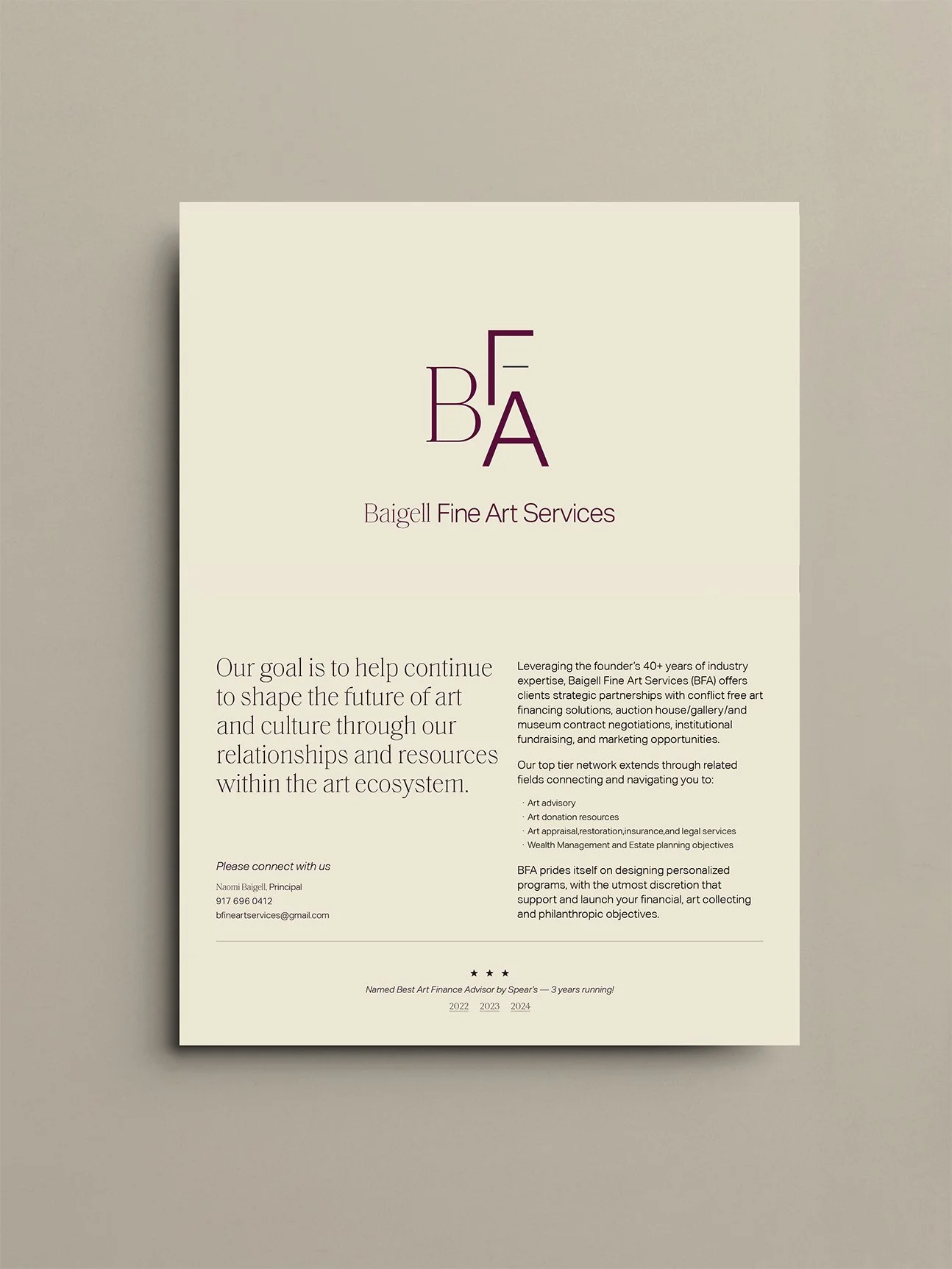In an industry built on relationships, discretion, and nuance, the design reflects BFA’s unique position as both a connector and a guide. Elegant and understated, it holds space for meaning—just as BFA does for its clients and their collections.