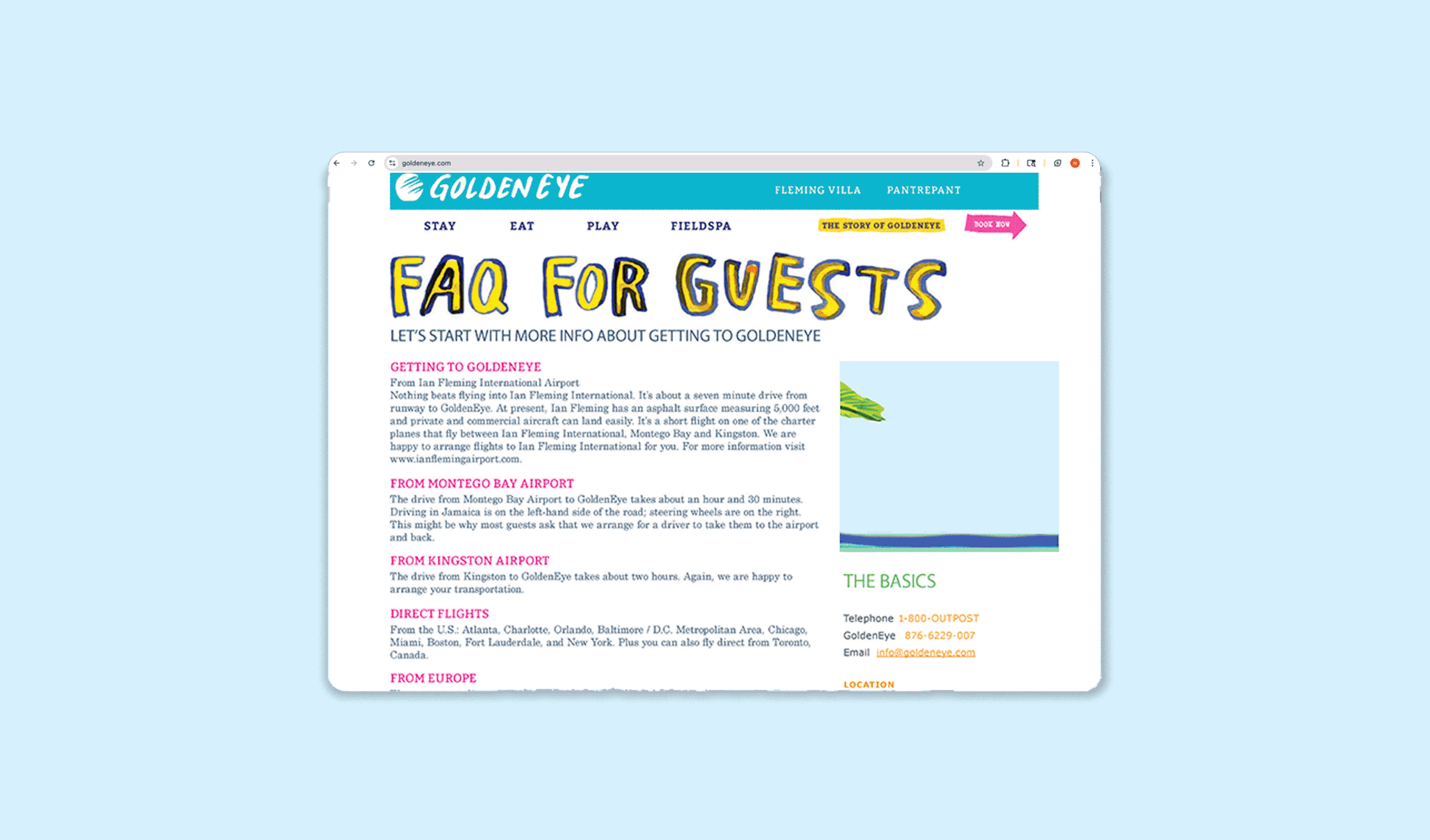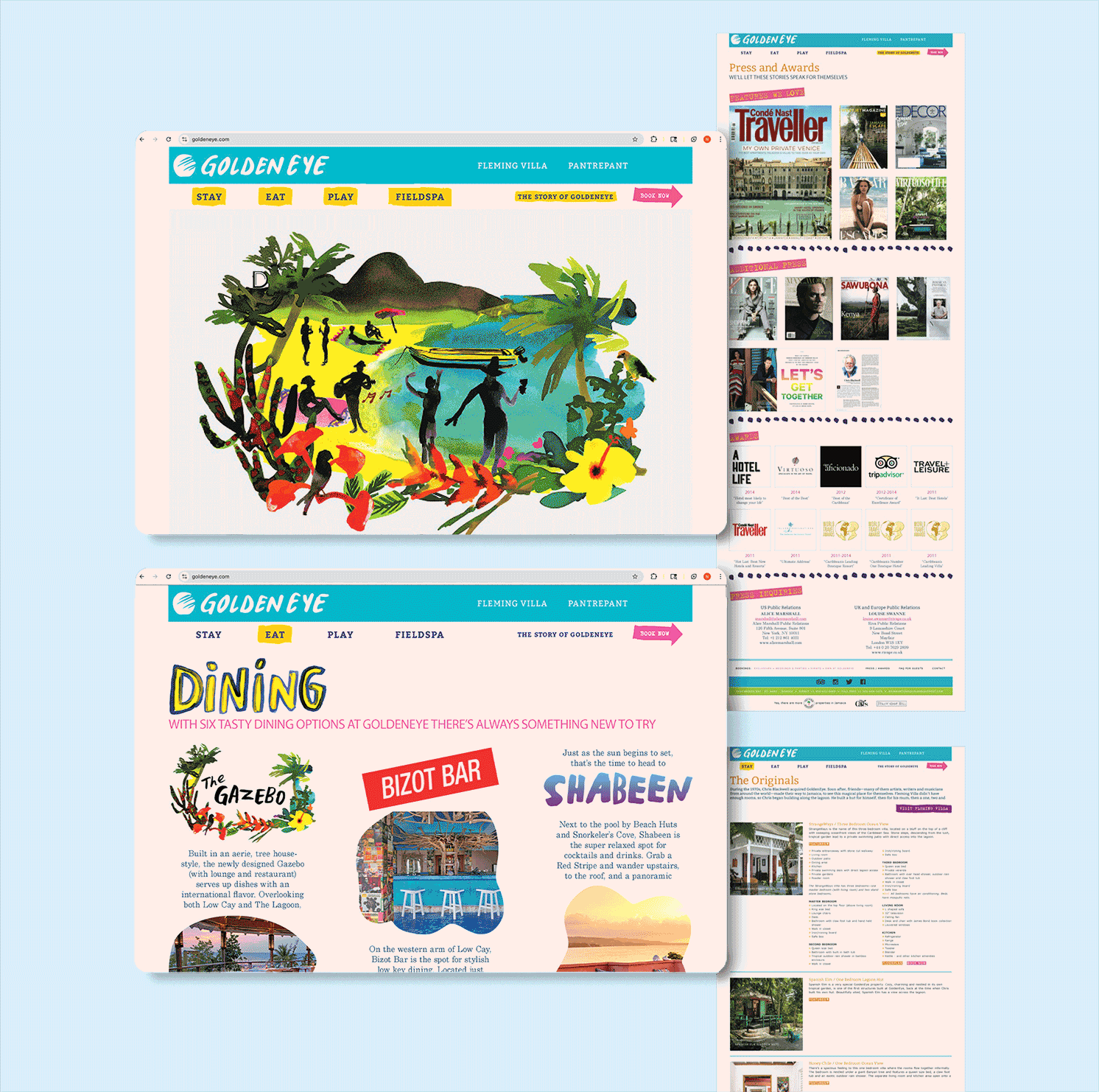 At Gabor + Garrett, a New York City design agency, I contributed to the creation of a new website for GoldenEye Resort in Jamaica. Inspired by the resort’s playful, colorful, and award-winning character, I brought custom illustrations to life through dynamic animations that enriched the site’s visual appeal. I also crafted intuitive, visually engaging layouts that supported GoldenEye’s marketing goals while delivering a delightful and immersive experience for guests.